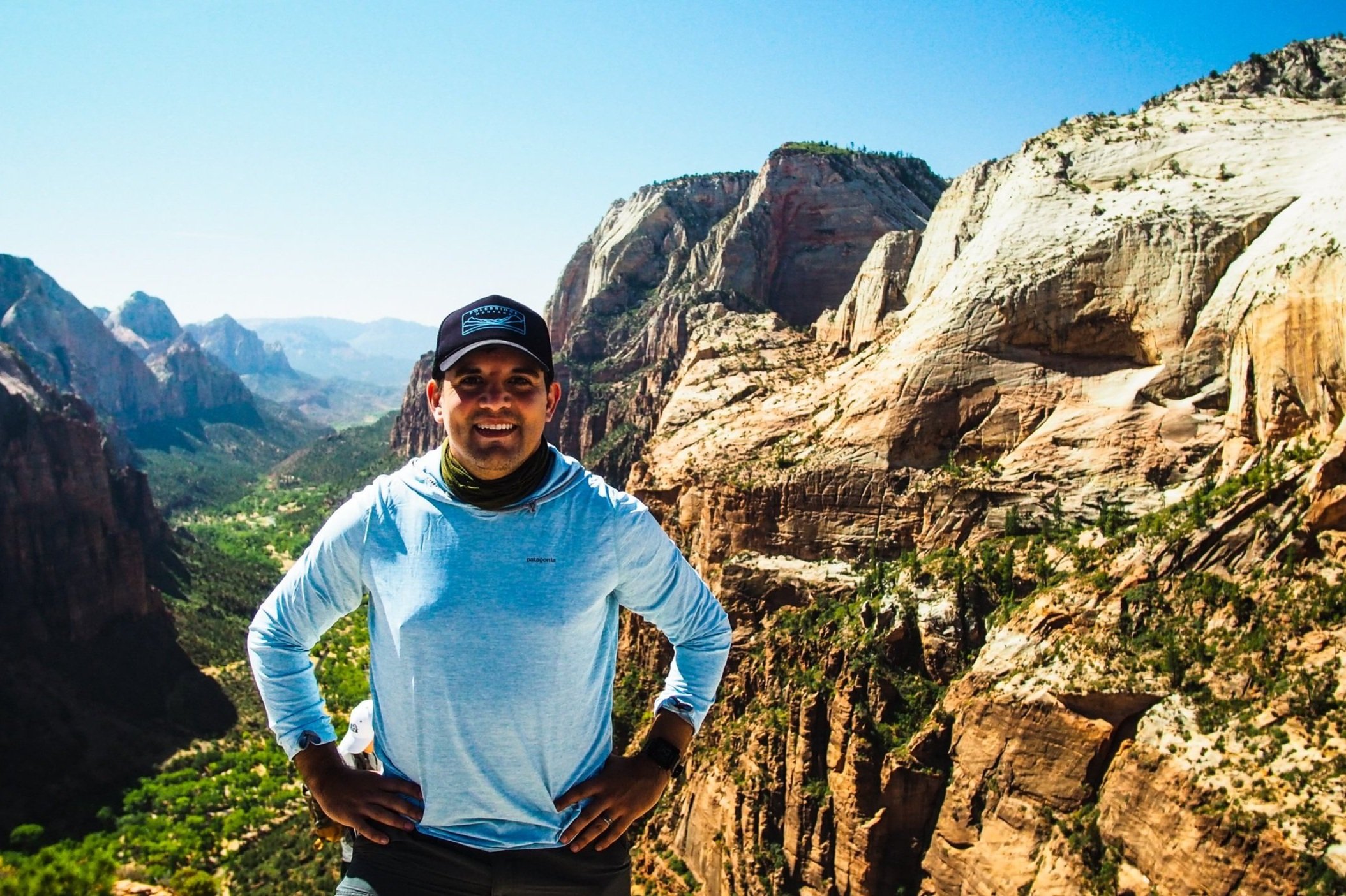Here’s a photo of me after our group conquered the chains section of the famed Angel’s Landing hike in Zion National Park. It’s a trek I’ll never forget—don’t look down!